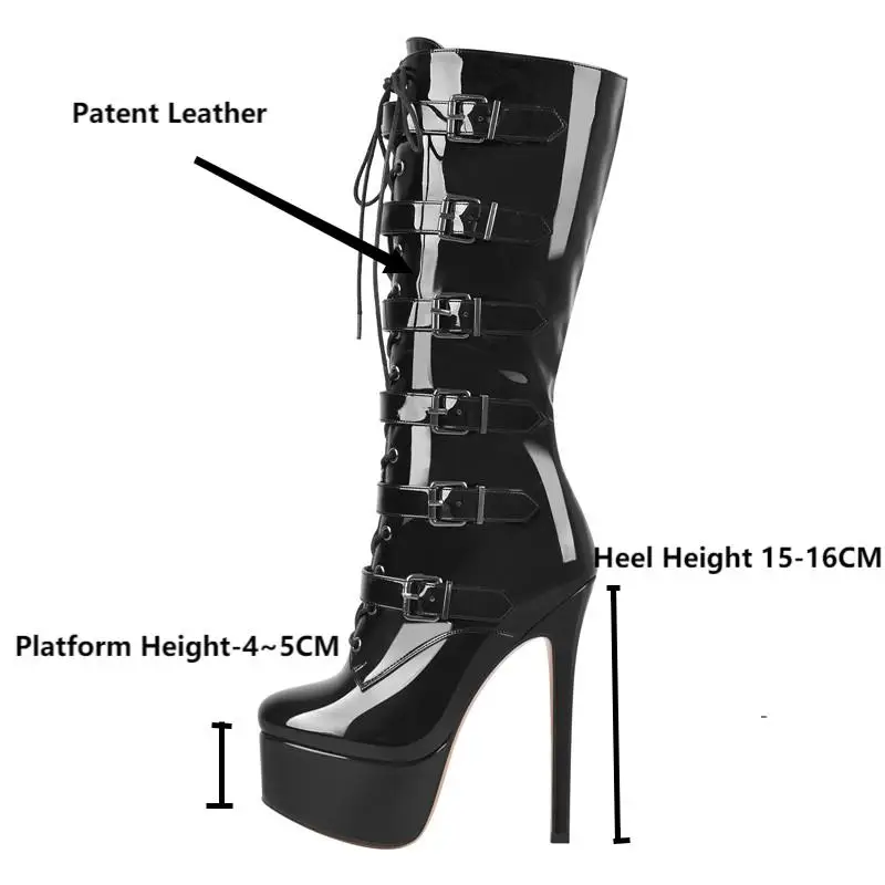 Women Shiny Black Patent Leather Platform Ankle Boots High Thin Heel Heeled Metal Plates Buckle Stilettos Boots