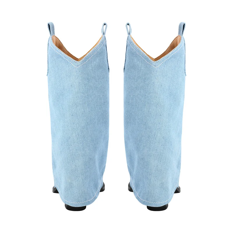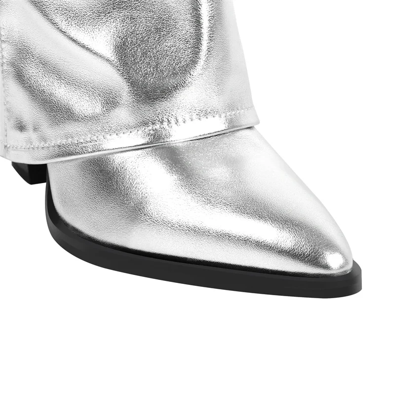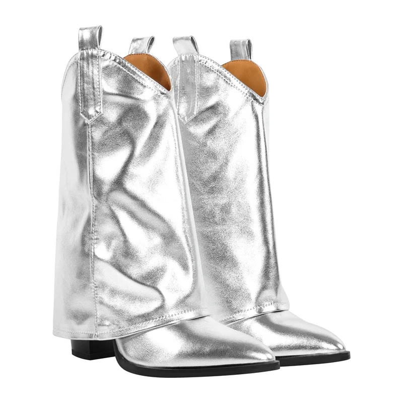 Women Sliver Pointed Toe Mid-Calf Chunky Heel Fold Over Boots