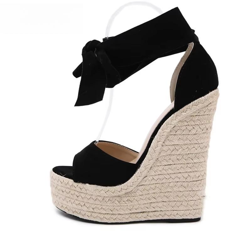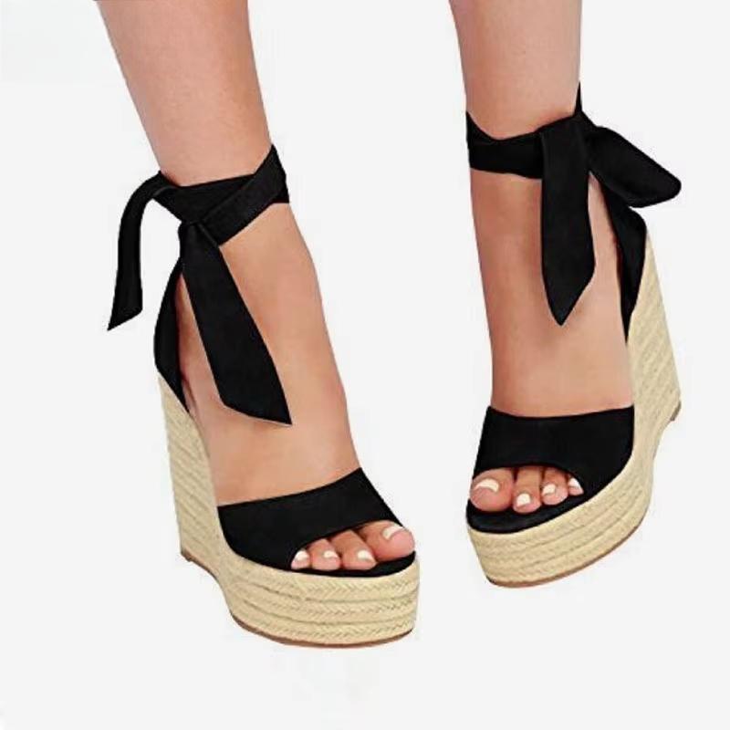Women Summer Butterfly Knot Solid Black Open Toe Sandals Fashion Platform High Heel Wedge Shoes Ankle Bowtie Dress Pumps