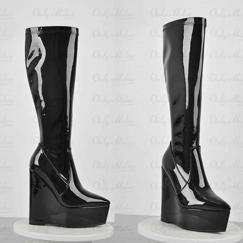 Wedge Knee High Boots Women's High Heels Platform Winter Fashion Party Black Matte Zip Handmade Brand Boots