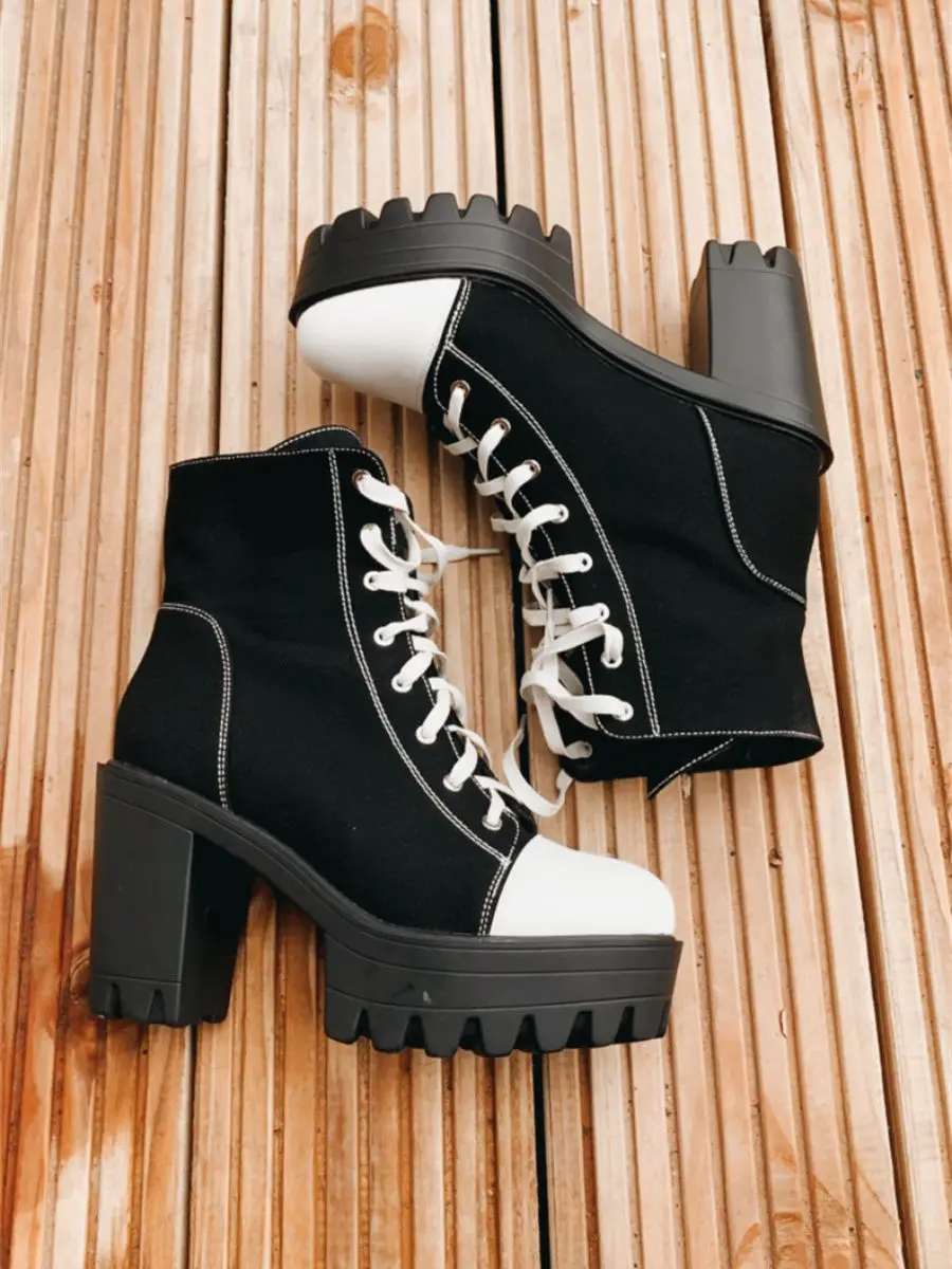 Women's Platform Lace Up Canvas Ankel Boots Block Chunky Heels Shoes