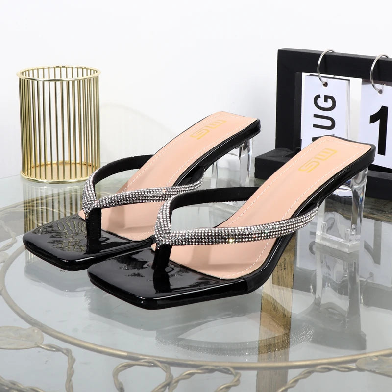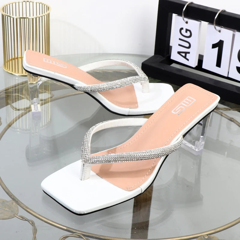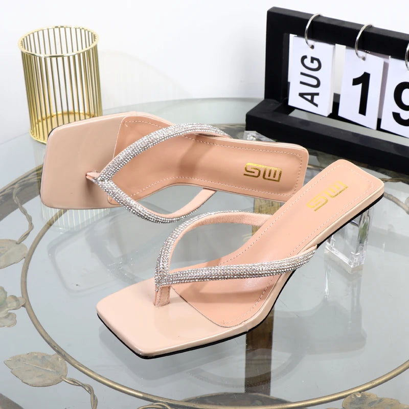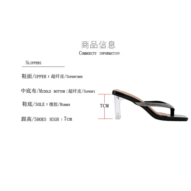 women's shoes Factory direct sales summer high heel women slippers head rhinestone flip-flops transparent square heel shoes